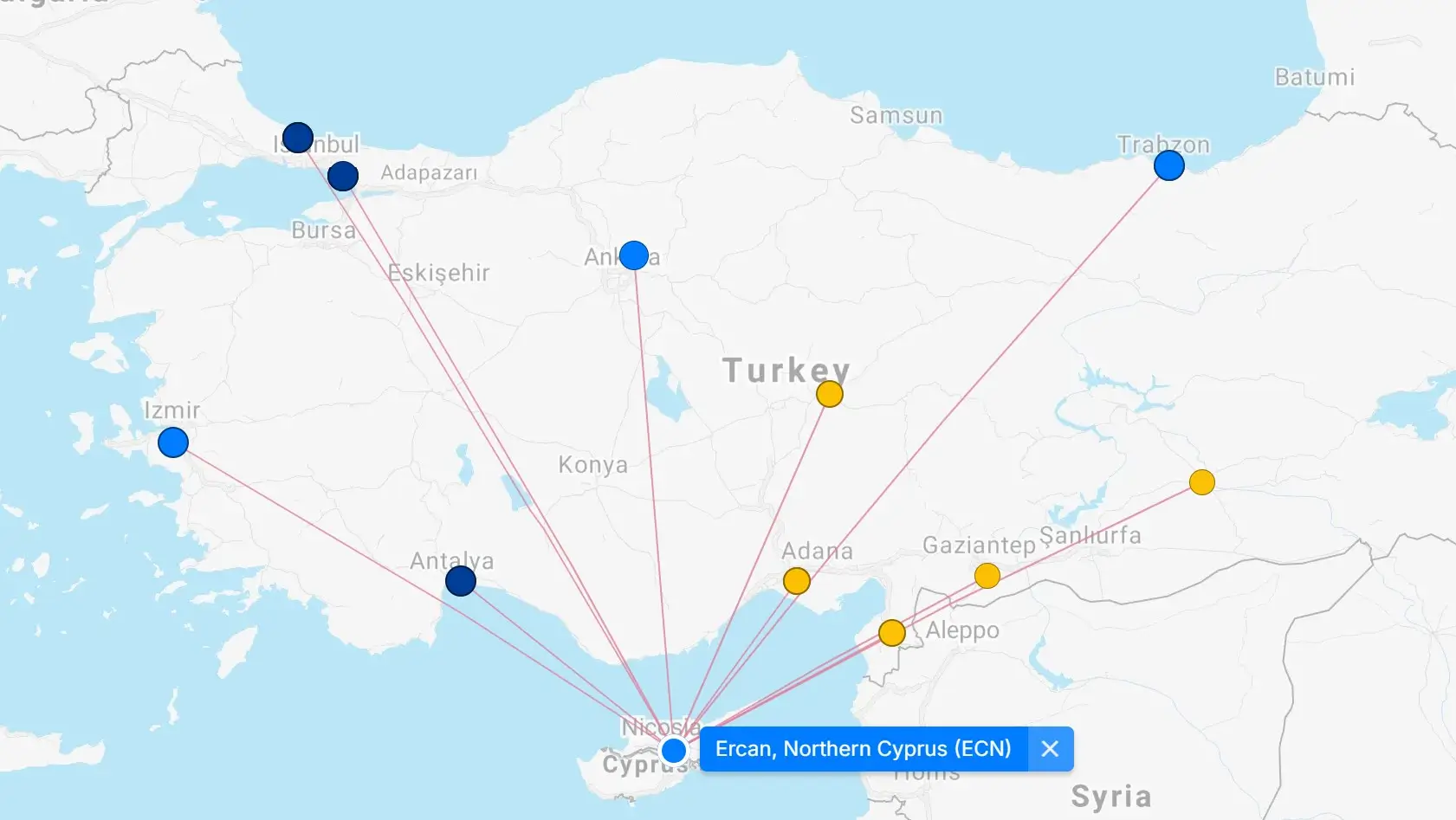 Ercan Airport is 13 km from Nicosia. Flights to this airport are available only via Turkey. There are flights from Istanbul, Ankara, Trabzon, Izmir, Antalya, Kayseri, and Adana. Approximately five million passengers use this airport each year. Flights outside Turkey are operated via Istanbul. Turkish Airlines, Pegasus Airlines, and AnadoluJet use this airport for their flights.