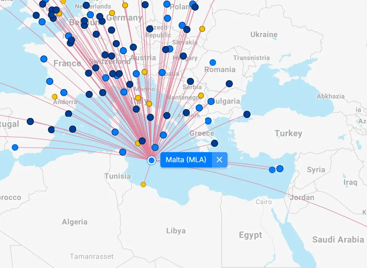 Malta International Airport is the only airport connecting this island to the rest of the world. Approximately ten million passengers use this airport annually. The most frequent flights to Malta International Airport originate from Italy, the United Kingdom, Germany, France, Poland, Spain, Greece, Belgium, Switzerland, and Austria. Direct flights to Malta are available from Paris, London, Düsseldorf, Milan, Birmingham, Amsterdam, Berlin, Brussels, Lyon, Madrid, Vienna, Frankfurt, and many other destinations.