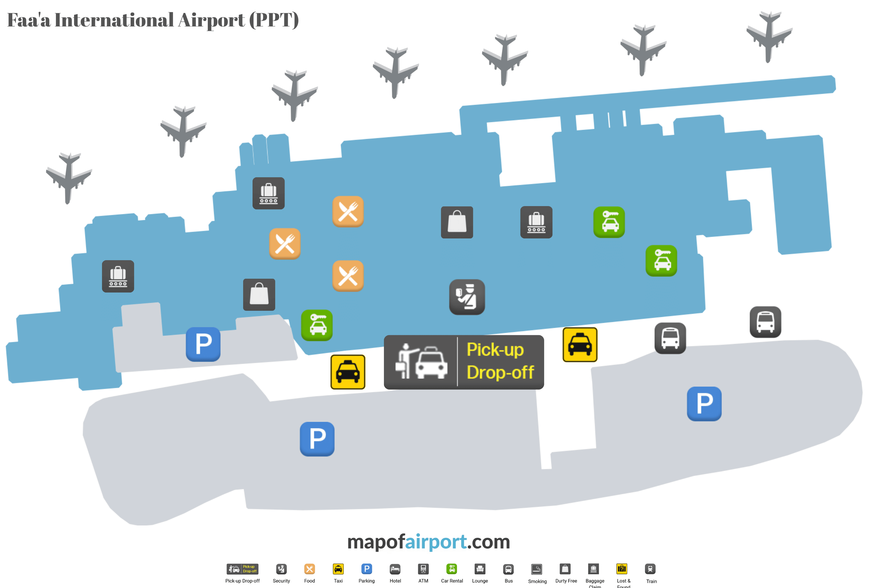 Tahiti Faa’a International Airport is located on the northwestern coast of the island of Tahiti. The airport is 5 km from downtown Papeete. Tahiti Faa’a Airport is the only international airport in French Polynesia. Approximately two million people use this airport each year. Flights depart from Tahiti Airport to destinations including Paris, Los Angeles, Fiji, Tokyo, Seattle, San Francisco, Auckland, Santiago, and Honolulu.