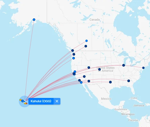 Hawaiian Airlines: Honolulu, Lihue (Kauai), Kona (Big Island), Hilo (Big Island), Los Angeles, San Francisco, Seattle, Las Vegas.